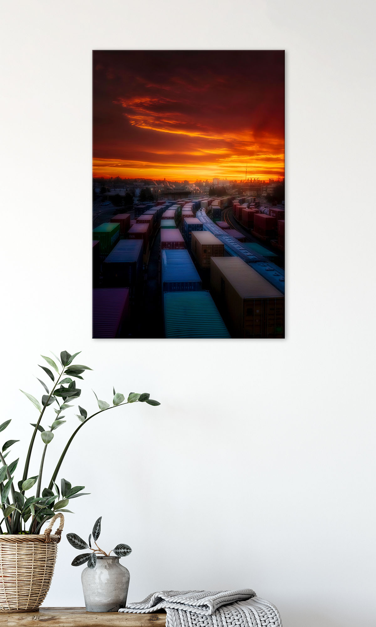 The colourful trains snake along the tracks, seemingly drawn to the magnificent sunrise that sets the sky ablaze with a swirling inferno of reds and oranges.